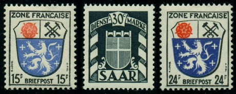 ostatní známky v sérii Rheinland, Pfalz, Württemberg a Baden jsou zemské znaky. měl být vyobrazen znak Sárska jako je na známce uprostřed